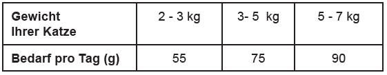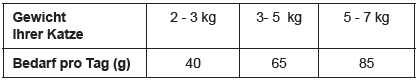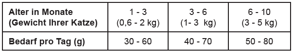 Der Futterbedarf von jungen Katzen variiert stark. Er ist individuell so anzupassen, dass das Gewicht der wachsenden Katzen auf der Rassenspezifischen Wachstumskurve liegt. Kann am Anfang mit handwarmem Wasser ca. 15 Minuten zugedeckt eingeweicht werden.