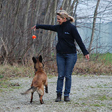 Die Bestätigung des Hundes kann sowohl mit Hörzeichen in Eigenmotiviation als auch per Hand erfolgen (siehe Video unten).